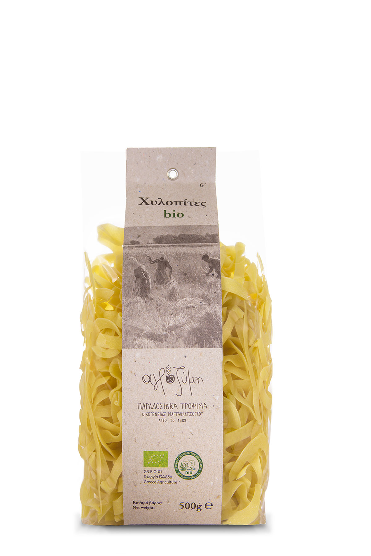 Οι βιολογικές χυλοπίτες Αγροζύμη είναι από τις ελάχιστες χυλοπίτες που κυκλοφορούν στην αγορά, χωρίς αυγά και γάλα. Για όλους εσάς που αγαπάτε αυτό το παραδοσιακό ζυμαρικό, αλλά ακολουθείτε διατροφή χωρίς αυγό και γάλα, ή θέλετε να απολαμβάνετε καθαρούς υδατάνθρακες χωρίς πρωτεΐνη, στο ίδιο γεύμα. Πιστοποιημένο βιολογικό σιμιγδάλι ζυμώνεται μόνο με επιλεγμένο νερό και αφού πάρουν το σχήμα τους, αποξηραίνονται αργά,σε φυσικές συνθήκες για να διατηρηθούν στο ακέραιο όλα τα θρεπτικά συστατικά του σιταριού και η ολόφρεσκη γεύση του. Μαγειρέψτε τις χυλοπίτες για λίγα λεπτά μέσα σε σάλτσα ντομάτας, ή απολαύστε τες με ψιλοκομμένα και σοταρισμένα λαχανικά.